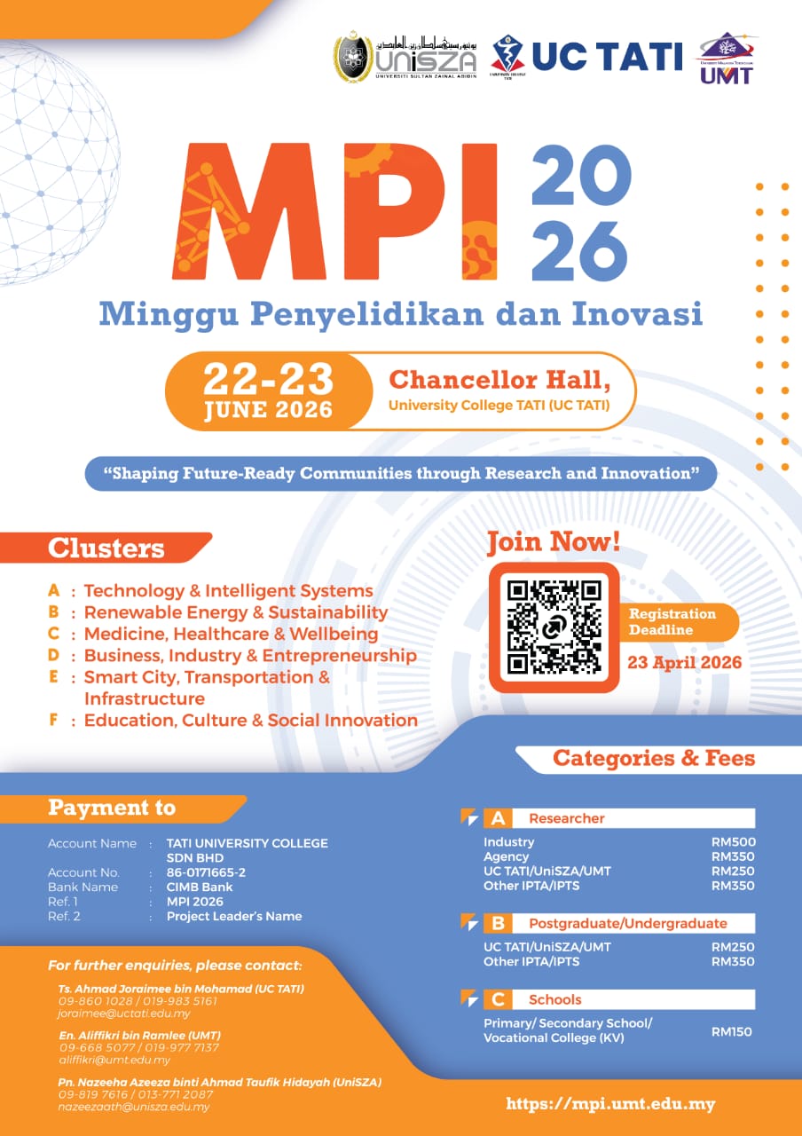 Minggu Penyelidikan dan Inovasi 2026 (MPI 2026) marks a significant milestone as the 10th edition of this prestigious collaborative programme involving University College TATI (UC TATI), Universiti Malaysia Terengganu (UMT), and Universiti Sultan Zainal Abidin (UniSZA). Since its establishment in 2017, MPI has served as a dynamic platform that promotes research excellence, innovation, and strategic collaboration among higher education institutions, industry players, and the wider community. For this landmark edition, UC TATI proudly serves as the main organizer and host of MPI 2026.
